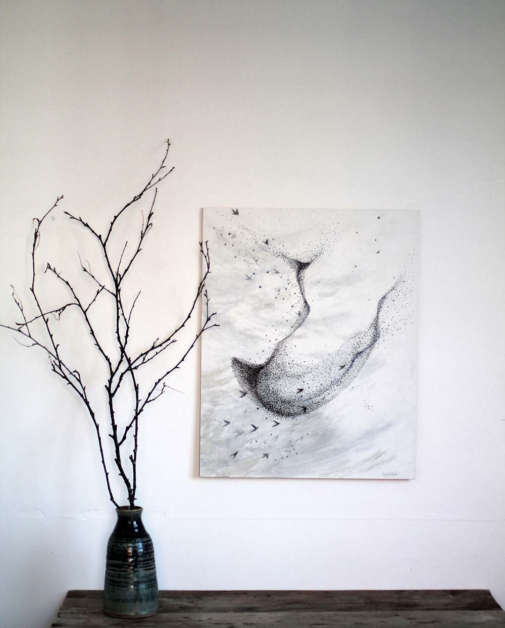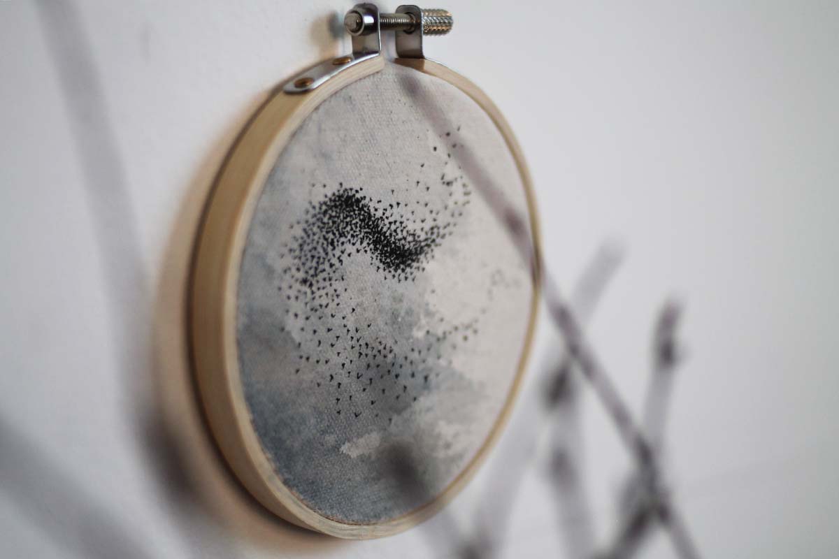 Muted grey skies painted with watercolour and natural acorn cap ink are filled with the life of a million wingbeats as charcoal, black acrylic ink and watercolour starlings burst into the heavens filling them with mesmerising murmurations.